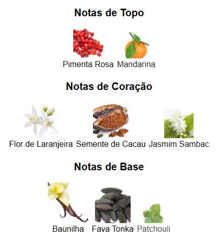 Uma fragrância oriental com forte influência floral, capaz de conceder uma perfeita profundidade de mistério e desejo nesta fragrância verdadeiramente feminina. As notas de cabeça são de tangerina e pimenta rosa, enquanto o coração é composto por cacau e flor de laranjeira seguido de baunilha e cumaru. Este perfume reluz com o frescor de uma rosa matinal coberta de orvalho.